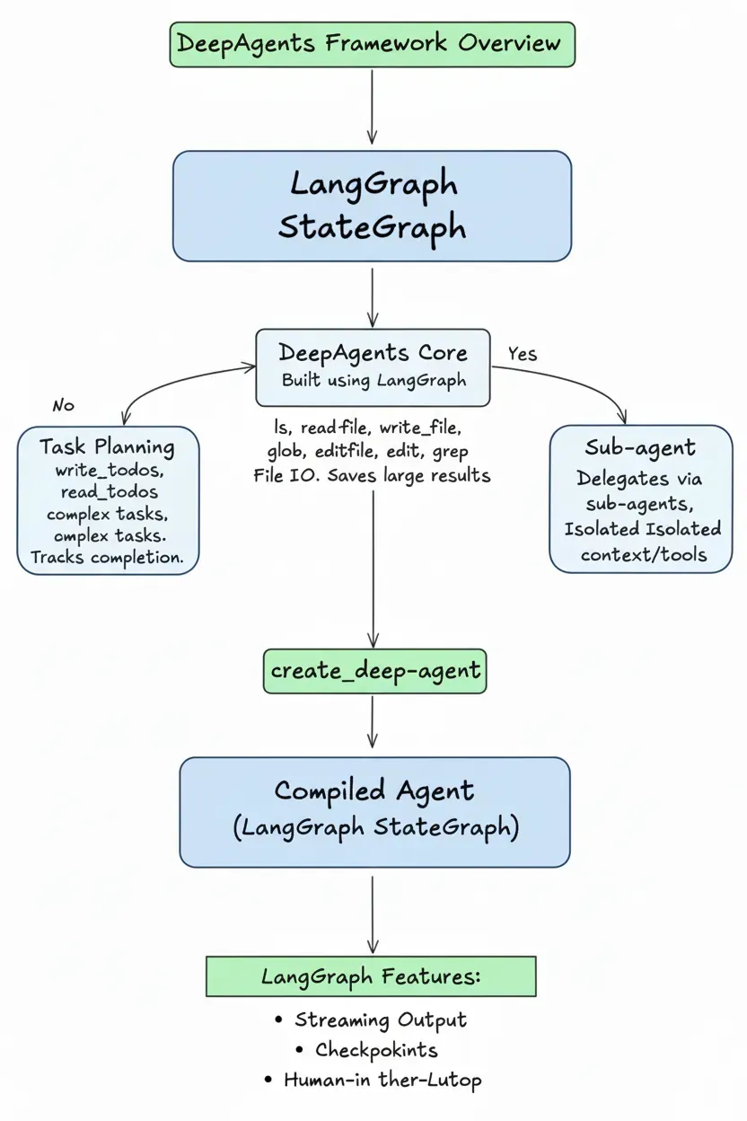 - 任务规划(Planning):使用内置 write_todos 和 read_todos 工具将复杂任务分解为结构化待办事项列表,agent 按列表执行并标记完成状态。