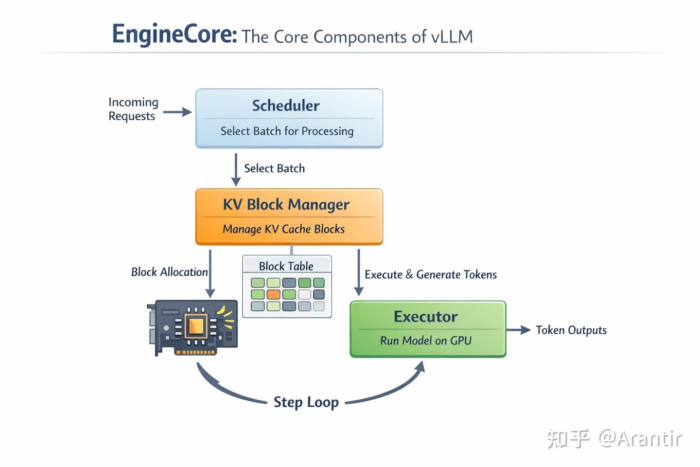 - KV Cache 管理器则负责显存中缓存的读写与复用。 整个流程高度优化,目标是让 GPU 计算单元尽可能持续满载。