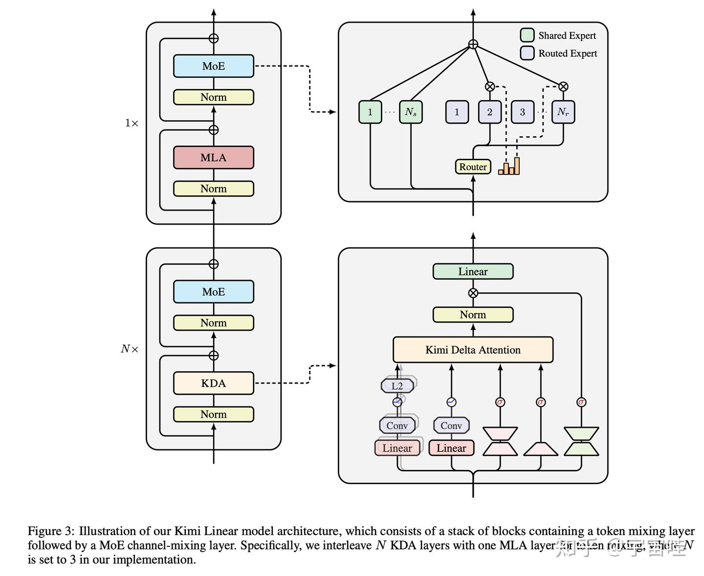 - 尽管KDA已经非常强大了,但纯粹的线性注意力在某些任务上,比如需要精确无误地从超长文本中检索某个细节时,仍然可能存在理论上的瓶颈。为了“取长补短”,Kimi Linear采用了一种非常务实的混合架构。它并不是把所有层都换成KDA,而是将KDA层和传统的全注意力层(论文里叫MLA, Multi-Head Latent Attention)结合起来使用。每3个KDA层之后,插入1个MLA层。