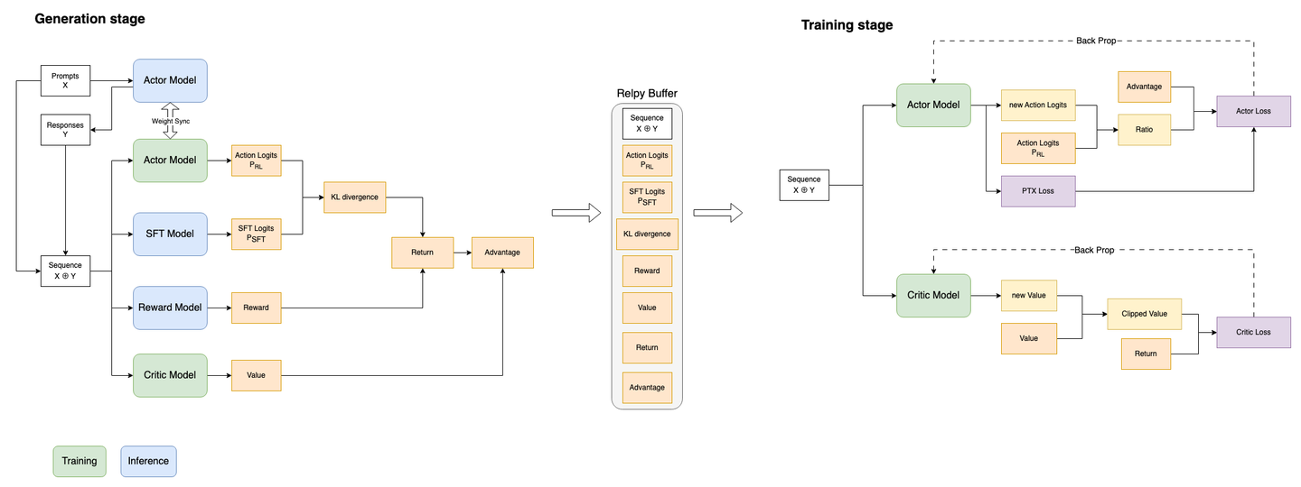 - PPO :把生成的每个token当成一个”action”,对模型的每个输出进行监督,这个过程使用的是value model/critic model完成的,loss上加上了裁剪机制限制策略的更新幅度,避免模型”学偏”.