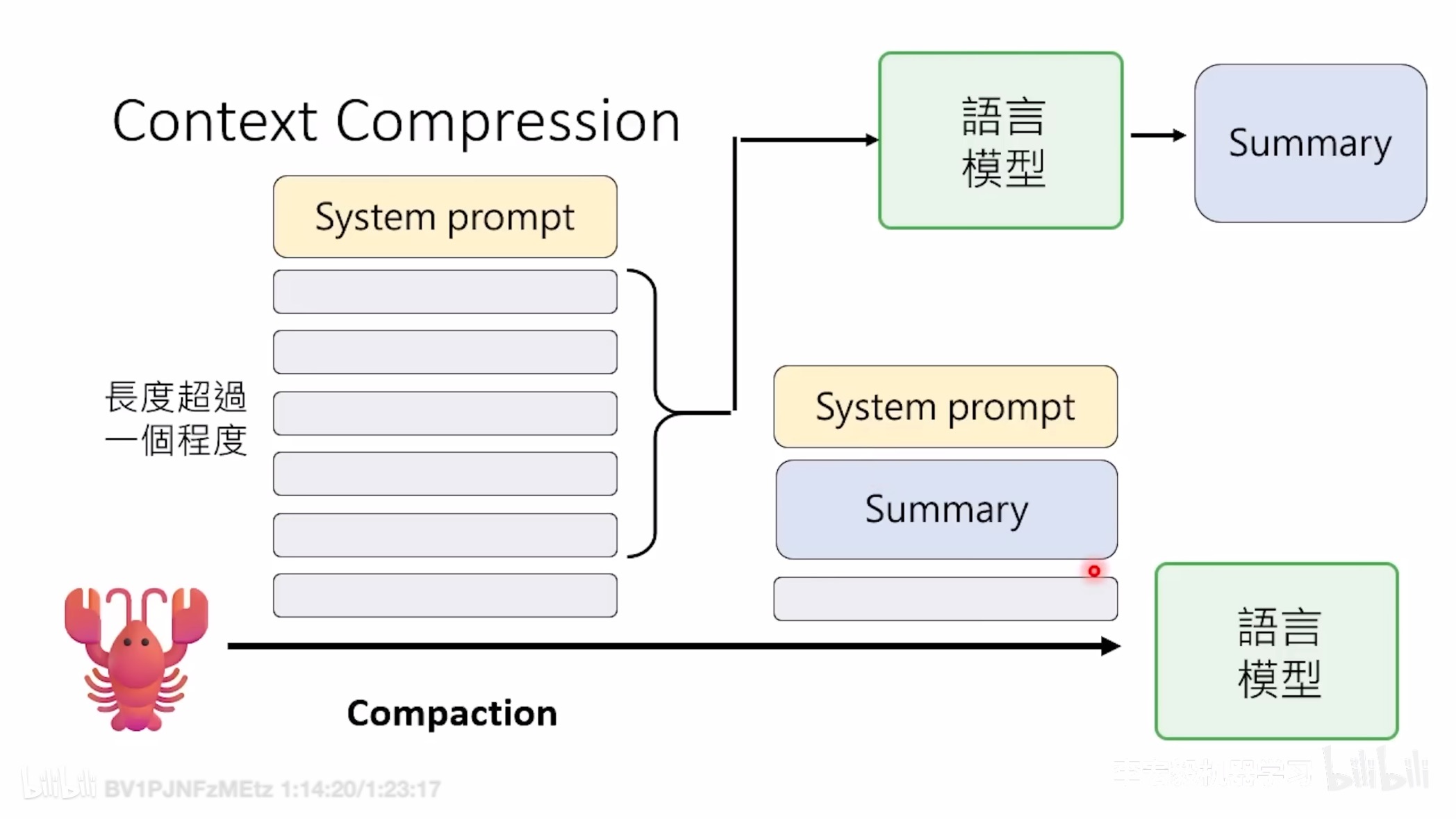 当会话接近或超过上下文窗口时,OpenClaw 自动触发压缩:旧消息 ──→ LLM 总结 ──→ 紧凑摘要条目 ──→ 持久化到 JSONL