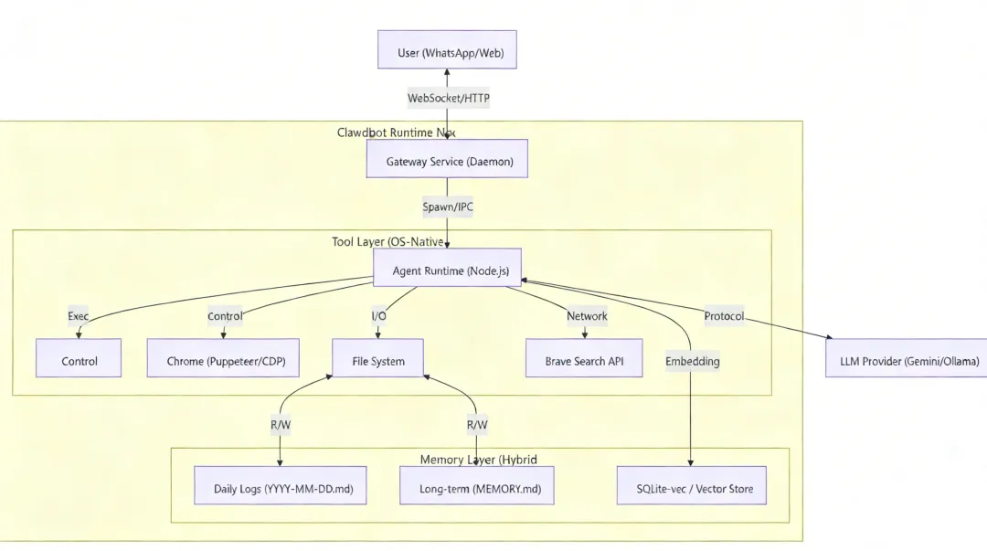 - 感知 (Observe):接收用户消息 + 读取最近的 MEMORY 上下文 + 系统状态。